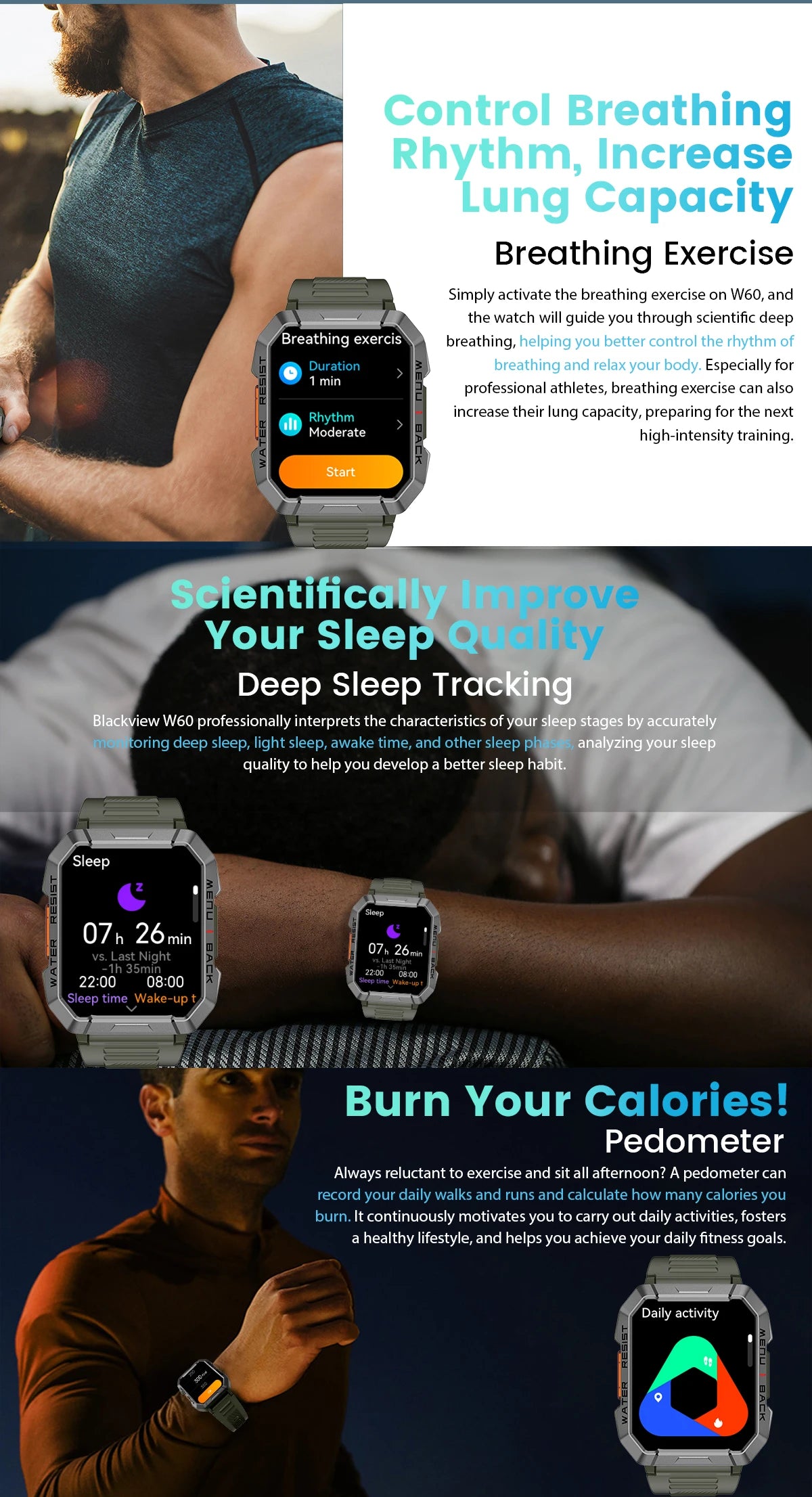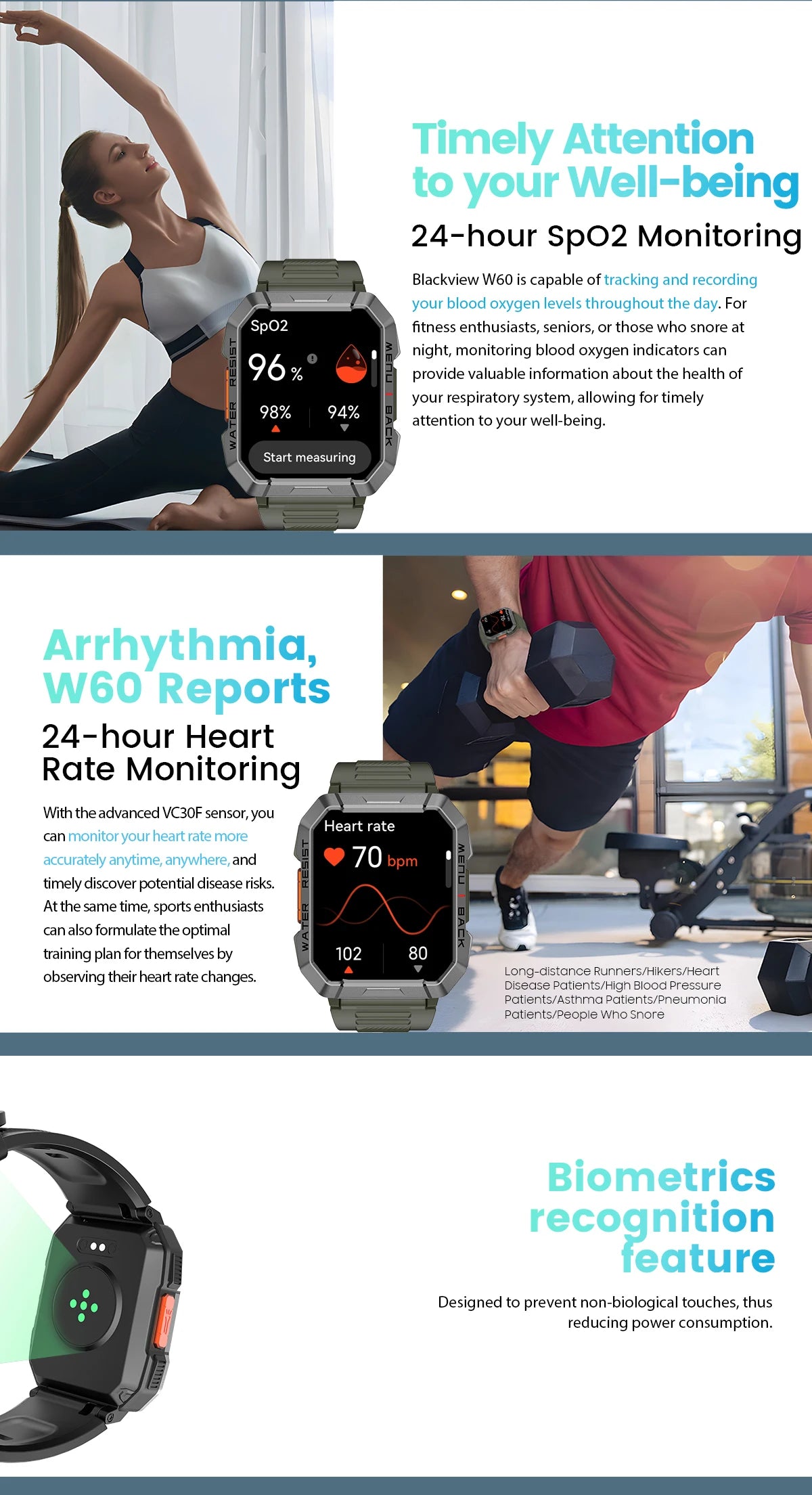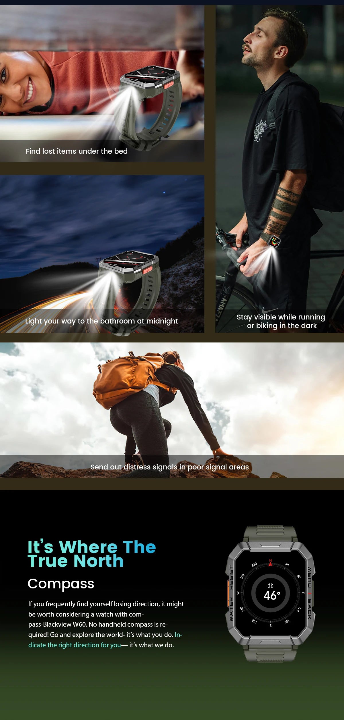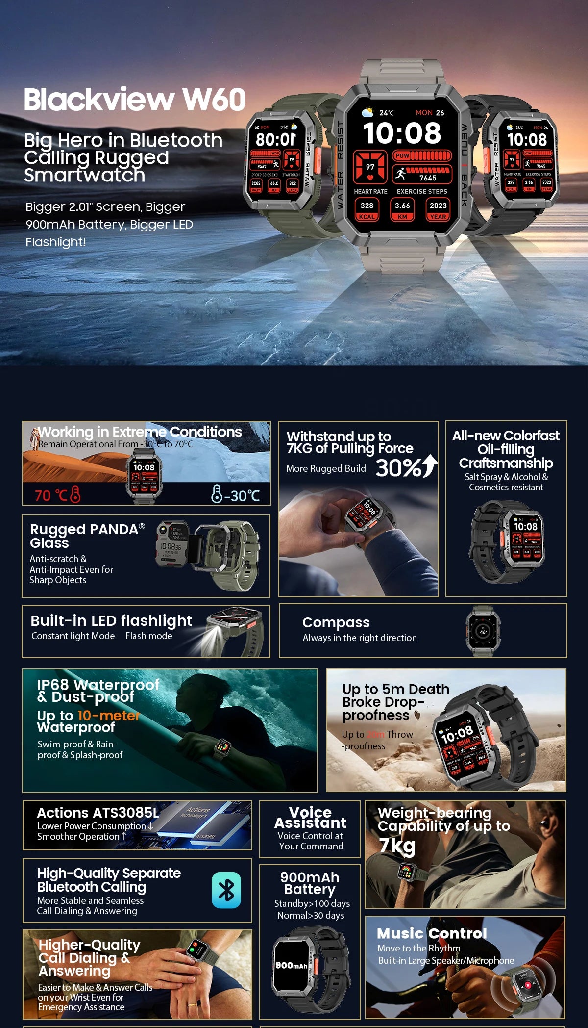 Blackview W60 2024 New Smartwatch 2.01'' HD Display TFT Rugged Smart Watch for Outdoor With Emergency Lighting Bluetooth Calling