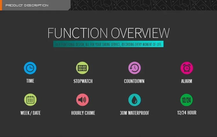 Feature: Stop Watch,Shock Resistant,Led Display,Auto Date,Chronograph,Complete Calendar,Water-Resistance,Alarm,Week Display